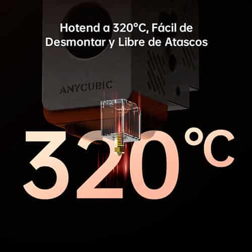 El hotend totalmente metálico puede llegar a alcanzar los 320°C, lo que permite trabajar con una amplia gama de materiales de alto rendimiento. Su diseño modular facilita su mantenimiento, ya que se puede desmontar rápidamente sin necesidad de herramientas.