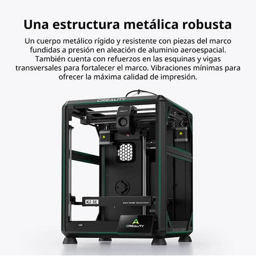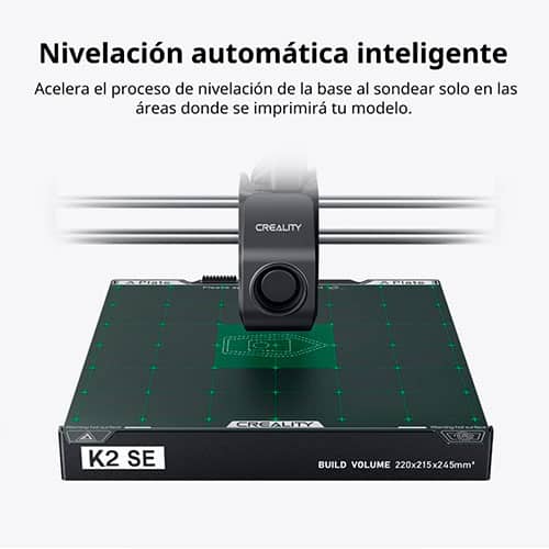 La Creality K2 SE es una impresora 3D que incorpora extrusor Direct Drive de doble engranaje, boquilla de cambio rápido con temperatura de hasta 300 °C, nivelación totalmente automática y cama calefactada de 100 °C. Ofrece una velocidad máxima de 500 mm/s, aceleración de 20.000 mm/s² y un volumen de impresión de 220 × 215 × 245 mm. Dispone de conectividad Wi-Fi y USB, almacenamiento 8 GB eMMC y pantalla táctil a color de 3,97″. Es compatible con el sistema CFS para impresión multicolor de hasta 16 colores, integra sistema de compensación de vibraciones, sensor de filamento, cortador automático de filamento y recuperación tras pérdida de energía, además de una puesta en marcha rápida en menos de 5 minutos.