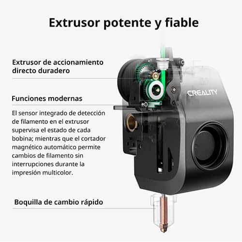 Incopora extrusor Direct Drive de doble engranaje con funciones muy útiles para el día a día: sensor de agotamiento de filamento integrado en el propio extrusor y un cortador magnético automático que facilita los cambios de filamento cuando imprimes con CFS. Además su boquilla es de cambio rápido lo que te ahorra tiempo en cualquier intervención.