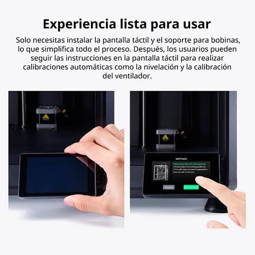 La K2 SE viene lista para que no te compliques: montas lo básico (pantalla táctil y soporte de bobina) y sigues el asistente en la pantalla para hacer las calibraciones automáticas, como la nivelación y la calibración del ventilador. En cuestión de minutos la tendrás preparada y lista para empezar a imprimir.