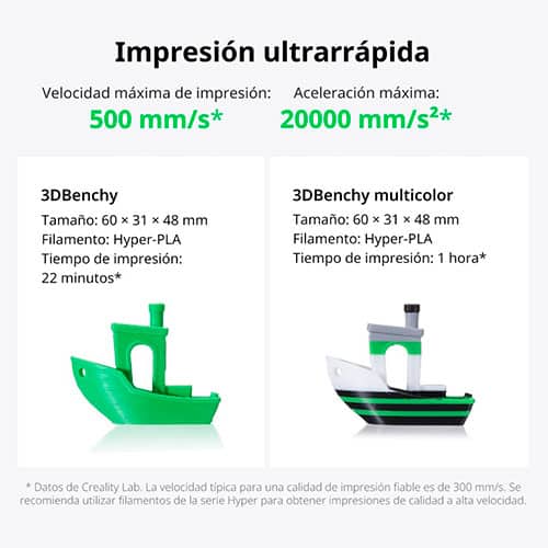 Llega hasta 500 mm/s y 20.000 mm/s² de aceleración, con una velocidad recomendada de uso alrededor de 300 mm/s para un equilibrio estable. Pero si quieres acortar tiempos, esta impresora 3D está preparada para trabajar con perfiles y filamentos adecuados para alta velocidad.